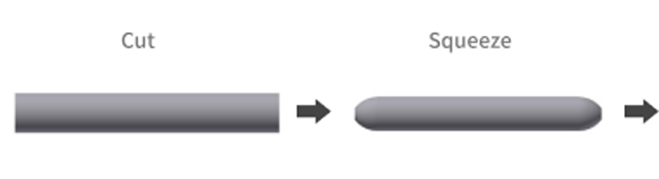 By tapping the material with a punch on a small diameter die relative to the original material diameter, the diameter of the material is narrowed down and the amount of extra material squeezed and the length of the material is increased.