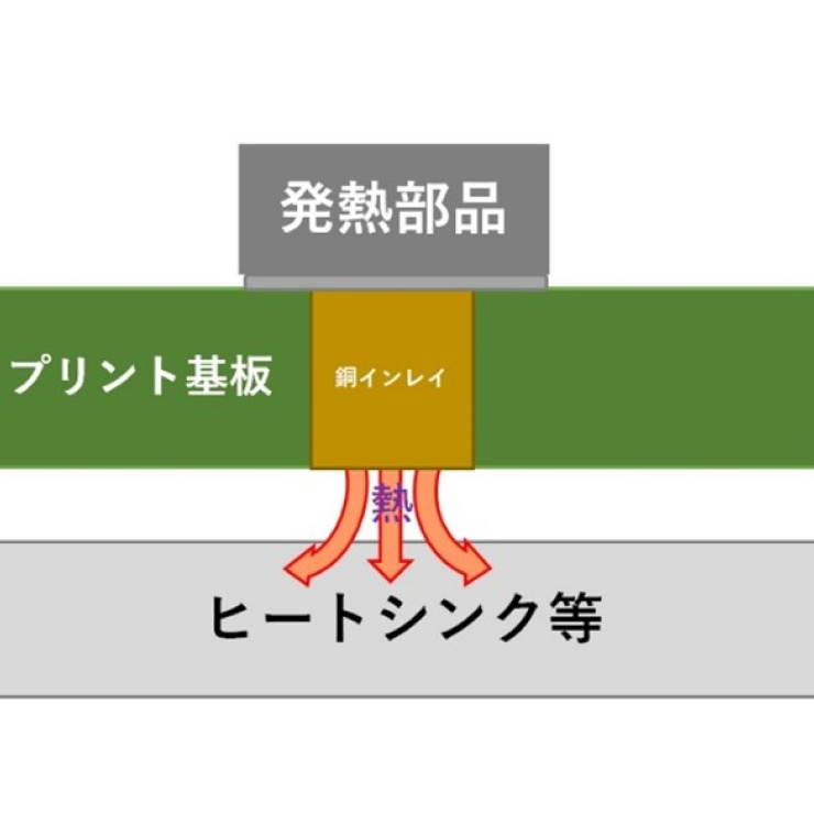 近年電子機器の高機能・高性能化による部品の小型化等、プリント基板に搭載される部品の発熱が増大しており、この発熱部品の熱を基板直下のヒートシンクへと効率的に逃がす為、プリント基板内に銅インレイを埋め込んだ基板、いわゆる銅インレイ基板に使用されています。