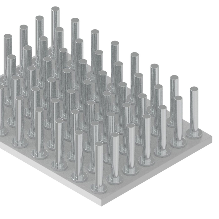 当社のヒートシンク用放熱ピン・放熱端子は、金属線材を圧造加工して、ご要望の形状へ加工しますので、押し出し成形品と比べて、金型費用を安く抑えることが可能です。丸線をヘッダー加工したピンのヘッダー部を、放熱板にろう付けして接合することによりヒートシンクとなります。放熱ピンの長さ、放熱板上でのレイアウトが自由です。放熱性の高い全長の長い端子も製作可能です。