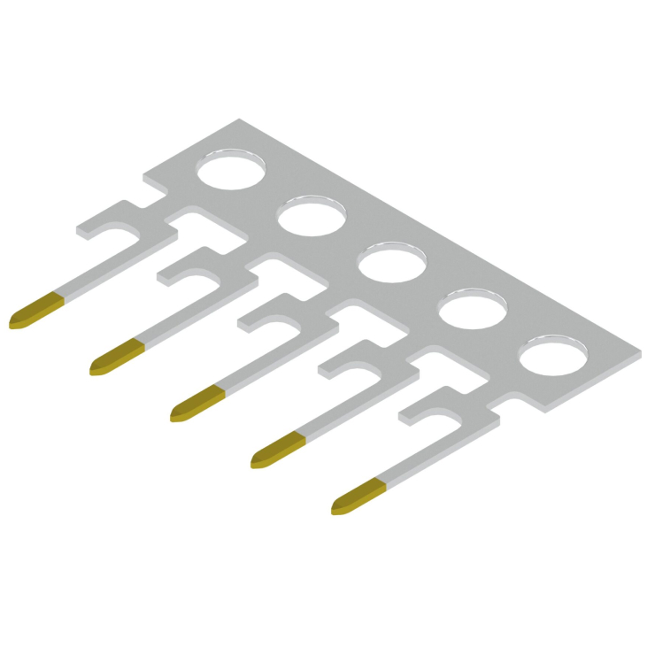 連続フープの金鍍金ラインで、プレス加工により形成された平板形状や立体的な複雑形状に対し、スポットめっきやストライプめっきの処理を行います。優れた特性から精密コネクタや接点などに用いられます。コネクタ用端子においては、「ニッケルバリア」などの技術を用いた部分めっきの対応をしております。