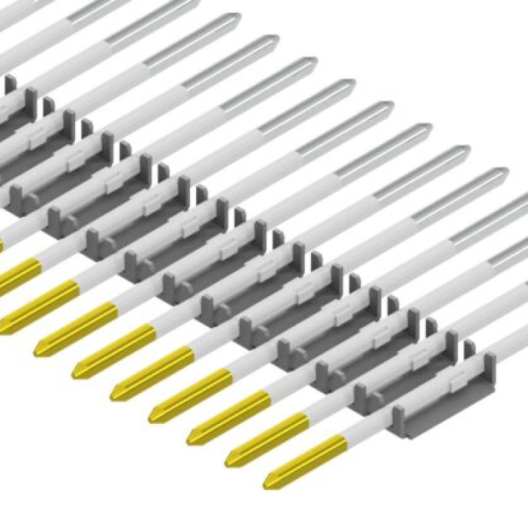 連続プレス加工されたキャリア(バンド)に埋め込んだピンを連続めっきします。角線、丸線、プレスフィットなどのバンドリア端子にご対応いたします。