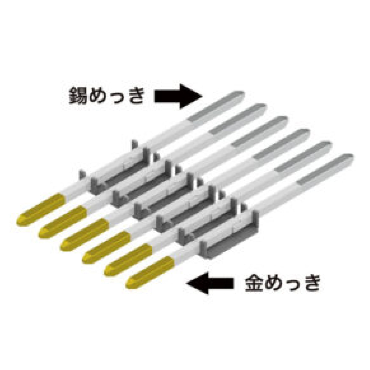 片方の先端が金めっき、もう片方の先端が錫めっきのような部分めっきも可能です。下地めっきとしてはニッケルめっきを施しており、ウィスカーの発生を抑制するために錫めっき部に対する部分的なリフロー処理を施すことも可能です。