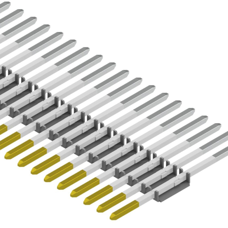 端子をバンド(キャリア)に直に植付け、リール巻きにて納入いたします。個々のハウジングのピッチに合わせたバンド寸法を多様に選定ができ、お客様の組立て工程において、一括挿入できるピン数が増え、生産ラインのタクトがあがります。