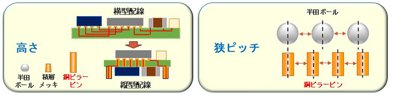 市場では配線長を短縮するため、横型配線から縦型配線への移行が進んでいます。 また、ハンダボールは球体形状のためアスペクト比が1:1ですが、銅ピラーピンは円柱形状のためアスペクト比を高くすることができ、ハンダボールに比べて狭ピッチでの接続が可能になります。