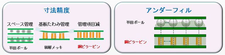ハンダボールは寸法ばらつきの他、溶融時の潰れがあるため、スペースの管理や基板のたわみ管理が必要になります。時間をかけてメッキを成長させる積層メッキ工法は、寸法にばらつきが生じやすく、接続時に基板がたわまないよう寸法管理が必要になります。また、部品と基板の隙間に樹脂を埋めるアンダーフィル工程も、ボール形状に比べて円柱形状の銅ピラーピンの方が管理しやすくなります。
