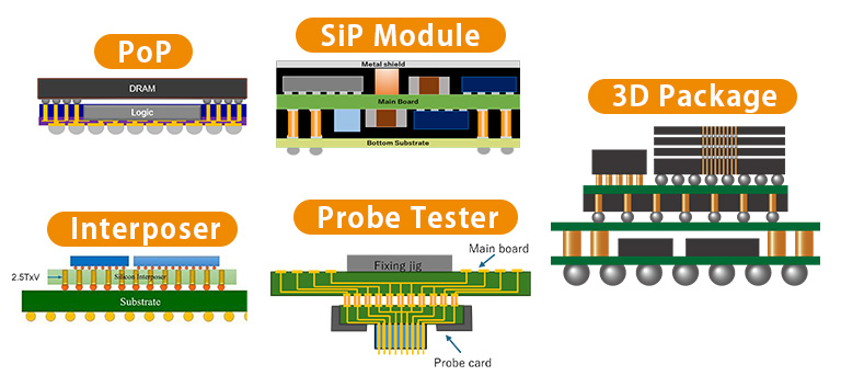 PoP、インターポーザー、SiPモジュール、3Dパッケージ、プローブテスター基板など、小型化や性能向上の実現に期待されています。