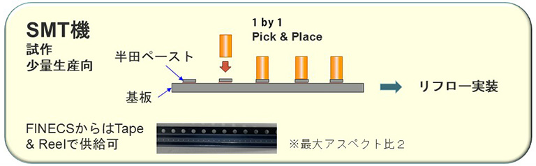 C-TECH社は、FINECSのピンを扱う専門メーカーであり、銅ピラーピンを用いた実装ソリューションを提案しています。ソリューションとして、ピンを仮基板に固定したピンアレイモジュール工法の提案や、ピンアレイモジュール自体の供給も可能です。