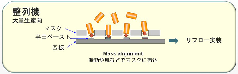 銅ピラーピンは、エンボステープに梱包されたものを表面実装機(マウンター)で基板に搭載し、リフロー実装することで固定できます。 ... 量産用の整列機は、ハンダペーストが塗布された基板上にピン挿入用のマスクを重ね、振動や風、磁性を利用し一度に大量の銅ピラーピンを整列・実装することが可能です。