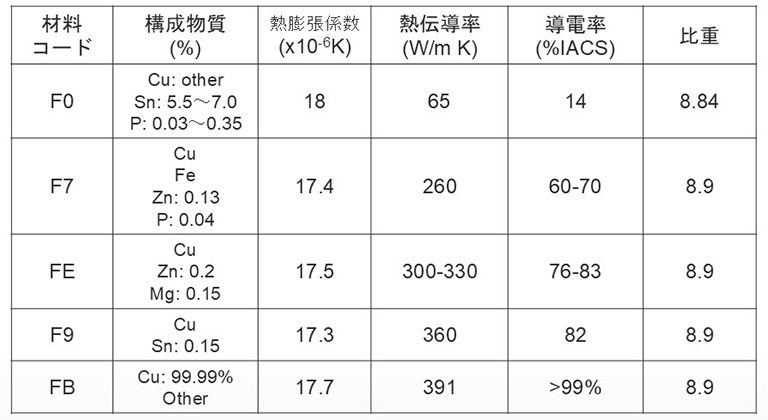 材料ごとに構成元素の含有率が異なるため、熱膨張係数、熱伝導率、導電率が変わります。導電率においては、熱放散効果の向上やEMIノイズの低減、信号品質の改善に貢献できる99%IACS以上の材料もご用意しております。