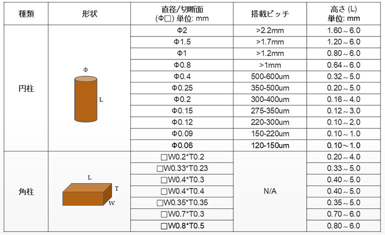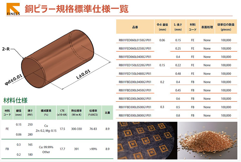 銅ピラーピン(Cu Pillar Pin)とは、銅合金でできた円柱形状の部品で、先端パッケージの回路接続に最適です。