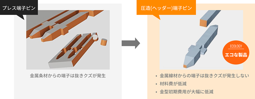 当社は、プレスフィット端子や端子ピン、各種圧造部品をはじめ、切削加工やプレス加工から圧造加工への置き換えを環境負荷低減のためにもご提案しています。また各種電子機構部品(複合製品)の一貫生産体制のご提案により、環境保護を促進する製品をご提供しています。